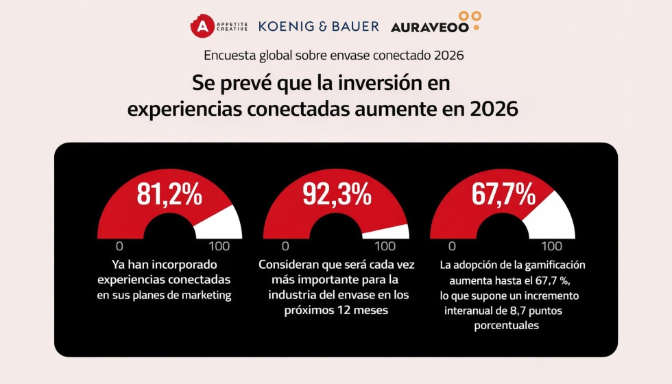 El 92,3% de los profesionales del sector considera que el envase conectado será cada vez más importante para la industria en los próximos doce meses y más allá. Así lo recoge la quinta edición del Global Connected Packaging Survey 2026, elaborado por Appetite Creative en colaboración con Koenig & Bauer AURAVEO. La cifra supone un incremento respecto al 88,8% registrado en 2025.