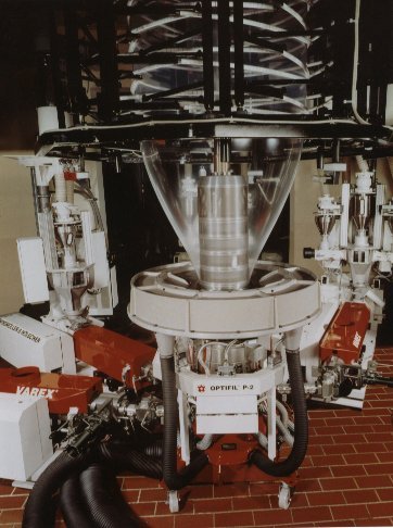 Figura 2 La coextrusión múltiple de películas proporiona a los materiales de envase y embalaje las cualidades precisas que se requieren par cada aplicación y constituyen un medio para reducir en origen las necesidades de reciclado. Hesta presentó sus sopladoras automáticas HK 453 y la HLL 803 de carrera larga, con extrusora horizontal de bujes ranurados enfriados intercambiables para optimizar su adaptación a los distintos materiales de moldeo. La segunda de las citadas puede fabricar capacidades huecas hasta 5 l. Uniloy Comec ha desarrollado el nuevo modelo MSC/D de extrusión contínua, especializado en la producción de envases para detergentes a un ritmo de 1.900 piezas/hora, en que se ha buscado facilitar el cambio de moldes mediante una serie de elementos que incluyen el grupo portaboquillas motorizado.