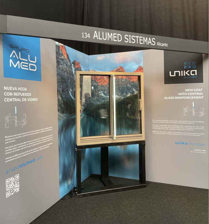 Una de las novedades de Alumed en la muestra fue la nueva hoja de refuerzo con vidrio templado 8+8 para ventanas minimalistas. La nueva hoja mejora de forma notable la resistencia al pandero y optimiza la funcionalidad en ventanas correderas de gran tamaño. Permite, asimismo, la opción de poder iluminar el refuerzo cuando la ventana está cerrada. Es posible alcanzar alturas de 7 metros y. Dependiendo del ensayo, es posible conseguir determinadas alturas, pero es necesario, en cada caso, calcular la salida que tendría el vidrio.