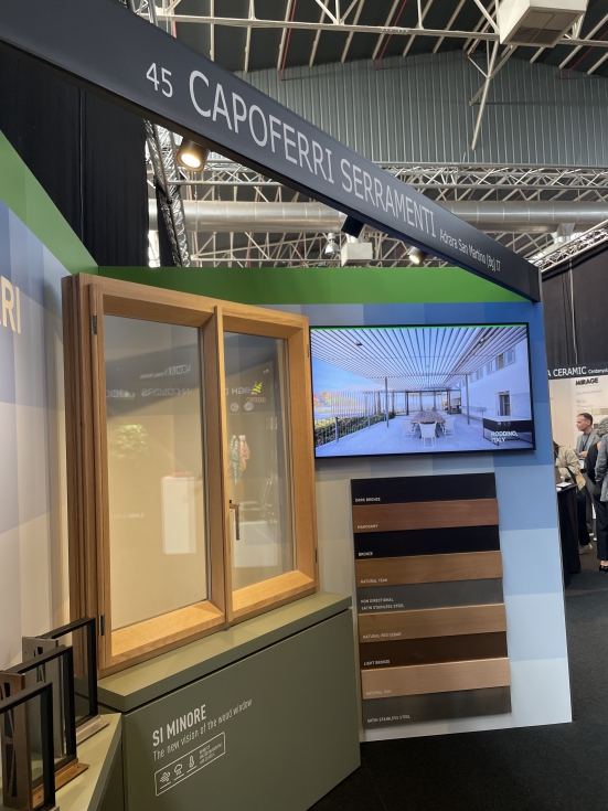 La firma italiana Capoferri presentó un nuevo tipo de ventana de madera de hoja sólida, con el objetivo de minimizar el perfil central de la ventana. El sistema se diferencia por su diseño, rendimiento y funcionalidad. El marco profundo permite montantes centrales muy delgados, que aportan elegancia y más entrada de luz natural. El sistema está fabricado con madera laminada patentada y ofrece gran estabilidad y durabilidad. El acristalamiento se presenta in fijaciones visibles, con lo que se incrementa el estilo minimalista y se potencia la visión interior-exterior. El diseño limpio del sistema se complementa con las manillas y bisagras, disponibles en versión cilíndrica expuesta o continua integrada.