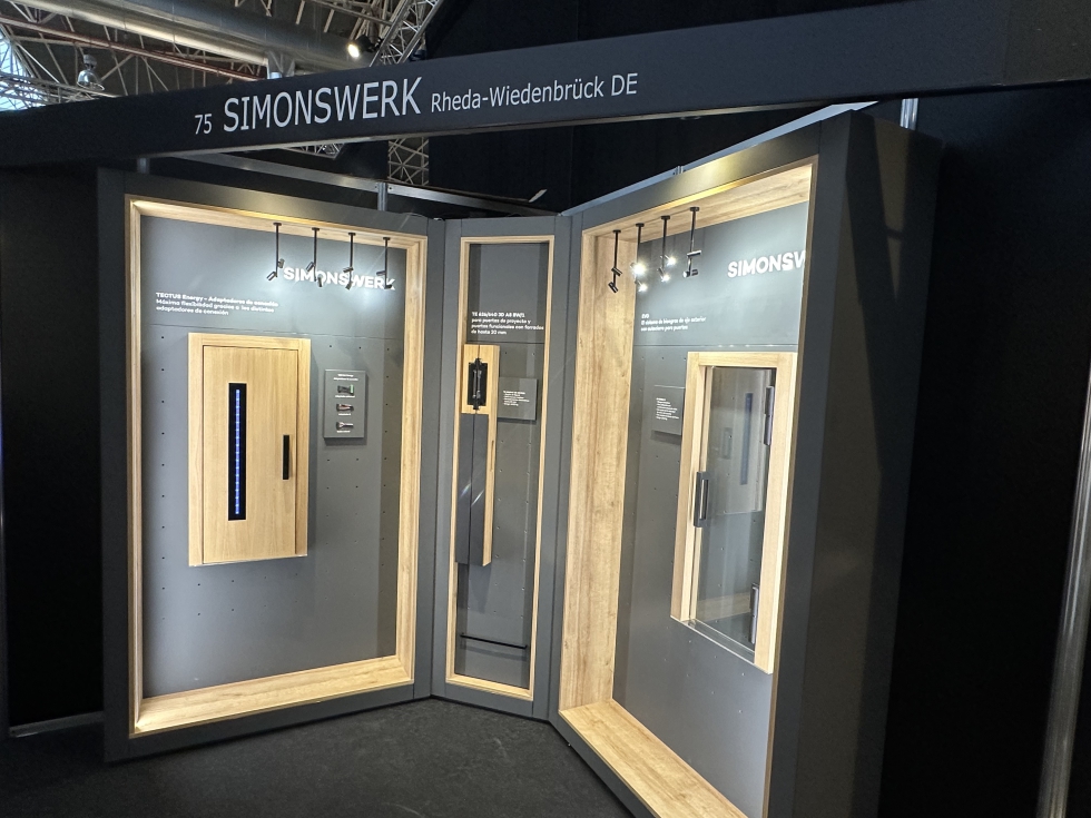 En Barcelona, Simonswerk, especializada en sistemas de bisagra de alta calidad, presentaba tres novedades. Una de ellas es la bisagra oculta Tectus Energy, que forma parte de la gama Tectus. En este caso, este modelo permite la posibilidad de pasar cables para instalar dentro de la hoja de la puerta, iluminación LED, sistemas de control de accesos o cerraduras electrónicas.