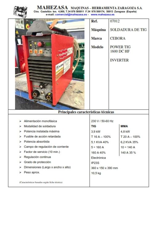 | Detalles | Monofásica, Inverter, Potencia máxima TIG 3,9 kW MMA 4,8 kW |