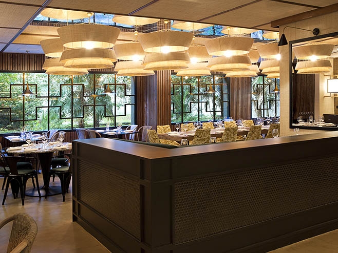 La iluminación técnica ha consistido en un sistema 094 integrado en la arquitectura, que ha permitido ocultar proyectores y orientarlos en función de las necesidades. Éstos llevan l ámparas QR súper spot de 10º de apertura, que crean un ambiente muy teatral iluminando sólo la superficie de las mesas.