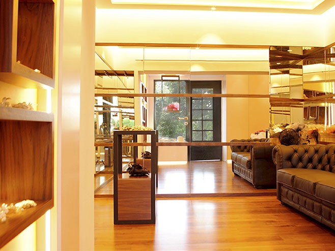 Todos estos elementos se combinan con la aplicación de papel dorado colocado en el techo y en la pared de los nichos que, enmarcado mediante una luz perimetral tipo led, potencia la personalidad y exclusividad de la tienda.