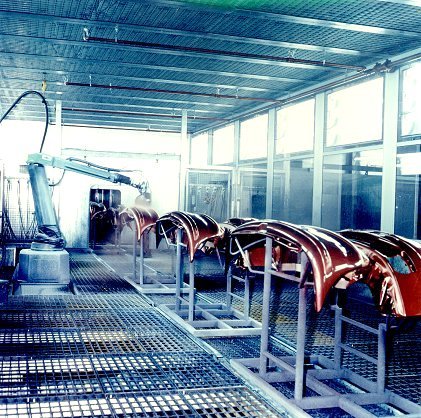 Las tres grandes cabinas de pintura de una longitud de 14,22 y 16 m para el servicio combinado en manual y automático por robots se llevan en un circuito con aire del exterior y aire de extracción.