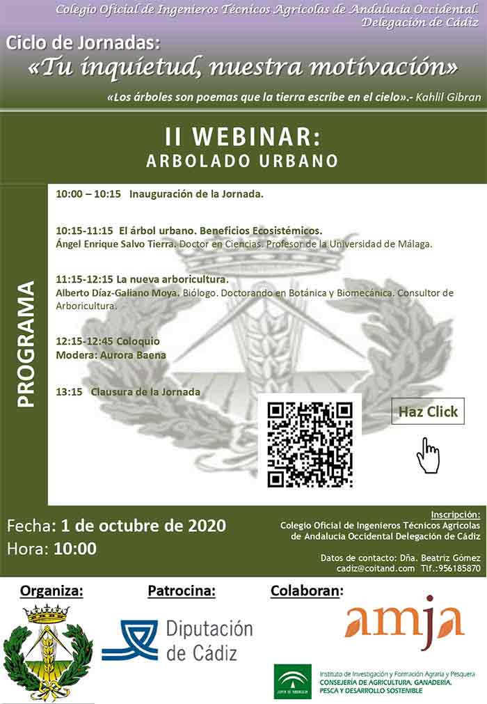 La Delegación de Cádiz del COITAND organiza dentro del Ciclo de Jornadas: Tu inquietud, nuestra motivación, el 2º Webinar sobre Arbolado Urbano, con la participación de Enrique Salvo Tierra y Alberto Díaz-Galiano Moya, patrocinado por la Diputación de Cádiz y con la colaboración de AMJA.