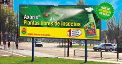 Una vez superada con éxito la fase de implantación de Axoris, COMPO a fin de estimular aún más su rotación, ha preparado una amplia campaña de difusión del producto entre los consumidores destacando el producto y sus ventajas en más de 470 vallas de 8 x3, situadas por toda España, especialmente elegidas cerca de los establecimientos que trabajan Axoris.