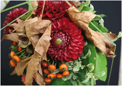Por la mañana, se propusieron dos ramos pensados para la venta por impulso. “Sensibles”, en palabras de Pascual, “es decir, ni ostentosos ni demasiado grandes”, adecuados al contexto económico, que no permite demasiados gastos. En el primero, se usaron rosas naranjas y escaramujo. Una rama flexible de enredadera dio forma redonda a la estructura, adornada con verdes ornamentales. Las dalias fueron las flores principales del otro bouquet, que también incluyó hojas secas de platanero. Pascual sugirió “añadir castañas, manzanas pequeñas y otras frutas del otoño”. En definitiva, “dos ramos rápidos, que se pueden vender a un precio bajo. Es necesario que tengamos varios iguales expuestos en la tienda”, recordó.