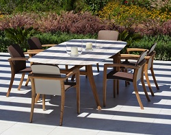 La colección Beacher está creada por Kris Van Puyvelde con estructura de madera de teca noble y el asiento de fibra acrílica resistente al agua y a los rayos UV.