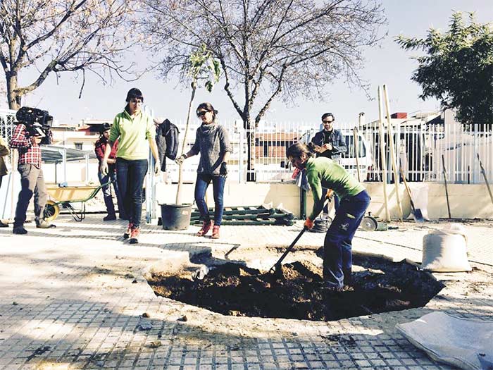 Ese mismo año y en esta misma edición de Luces de Barrio conozco a Cuarto Creciente, estudio de maravillosas arquitectas especializadas en arquitectura para la infancia, con el que abrimos “Agujeros Vegetales” en el Vélez de Guevara de Torreblanca y literalmente se traspasó el pavimento para volver a plantar. Una desafortunada intervención previa en este colegio había hecho desaparecer varios árboles y la tierra natural con la que contaba el patio de infantil. Era algo trágico y a la vez un reto emocionante: abrir de nuevo un camino de reconexión con la tierra y los árboles. Por eso, entre otras mejoras que se pudieron realizar, liberamos parte del suelo y plantamos una Phytocca dioica o… “Árbol de la bella sombra”. Lo hicimos con la pasión, fuerza y destreza de los niños y las niñas, la comunidad educativa y profesionales de la arquitectura, la psicología, la enseñanza y el arte. En común pudimos trasformar la dureza de los patios escolares en refugios de vida y color, justamente la esencia de los niños.