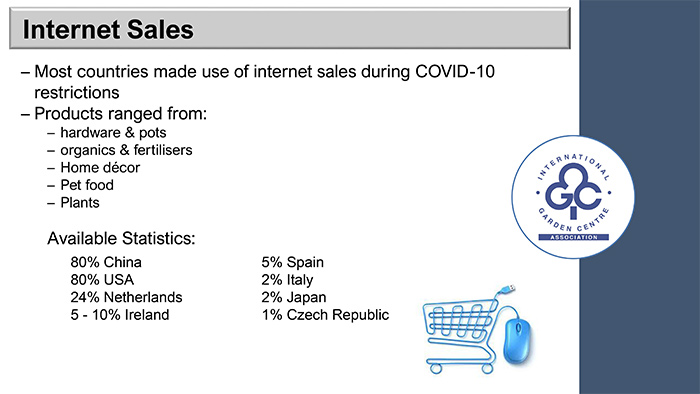 El Covid-17 ha obligado a cambiar los hábitos de compra y el ir al garden a comprar la planta, el fertilizante y la tierra, cargarlos en el coche y llevarlos a casa no ha sido posible en muchos países, por lo que la venta en internet ha ganado peso, obligando a muchos centros de jardinería a saltar a la red de una forma definitiva. Entre los países con mayor dependencia de la venta online, según el informe, destacan China (80%) y EE.UU. (80%), a los que le siguen Países Bajos (24%), Irlanda (5-10%) y España (5%). Al final de la cola, Italia (2%), Japón (2%) y República Checa (2%).