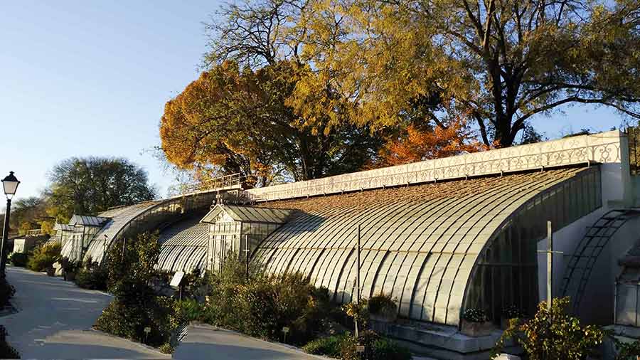 Hay 24 invernaderos, la mayoría de ellos de finales del siglo XIX, realizados en hierro y cristal, son los llamados históricos y otros denominados los invernaderos modernos, cuya estructura es de aluminio y policarbonato y que cuentan con automatismos para la aireación, el sombreo y el riego. Todos ellos están en uso y tienen diferentes funciones.