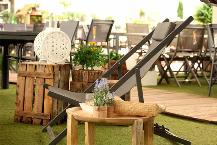 Por tipos de muebles, un imprescindible que no puede faltar en tu terraza o jardín son las tumbonas y los asientos colgantes. Hamacas, sillas, columpios… Todos ellos multiplicarán tus momentos de puro relax. Idóneos para disfrutar de un buen libro o una buena siesta. Para mayor confort, ubícalos en zona de sombra. Será tu oasis perfecto para los días en los que el sol caliente fuera con más fuerza.