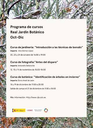 Esta programación formativa, que se mantendrá hasta al menos el primer semestre de 2020, está dirigida a todos los públicos. Todos los cursos serán ofrecidos por personal especializado en las distintas materias, con un amplio bagaje profesional y experiencia formativa. En todos los casos se entrega un certificado del Real Jardín Botánico con el número de horas realizadas y las materias impartidas en cada curso. Las clases teóricas se ofrecen en las propias instalaciones del Jardín Botánico, también algunas de las prácticas, y en el caso del curso de “Identificación de árboles en invierno” se llevará a cabo una salida de campo.