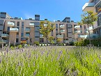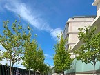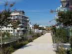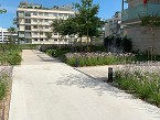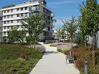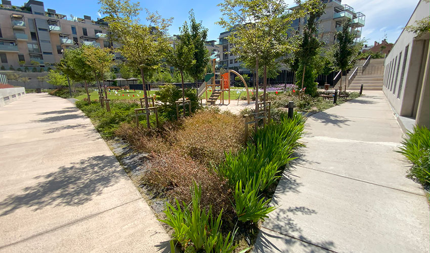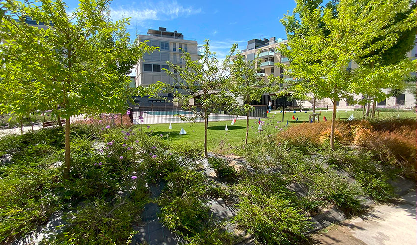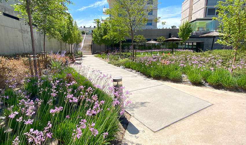 Una topografía particular con unas curvas de nivel muy orgánicas, con colinas y vegetación compuesta de distintas asociaciones vegetales, va enlazando los distintos ámbitos, dando lugar en su conjunto a pequeños jardines y bosques, donde el contraste entre las distintas texturas de la vegetación, sus volúmenes, los colores de las floraciones y la configuración del terreno, juegan un papel fundamental en el apoyo a la integración de los edificios, conectándoles mediante paseos y componiendo la nueva trama de la urbanización.