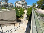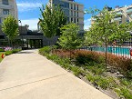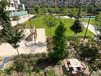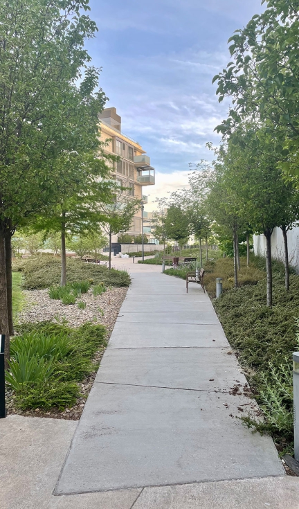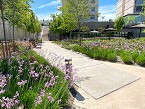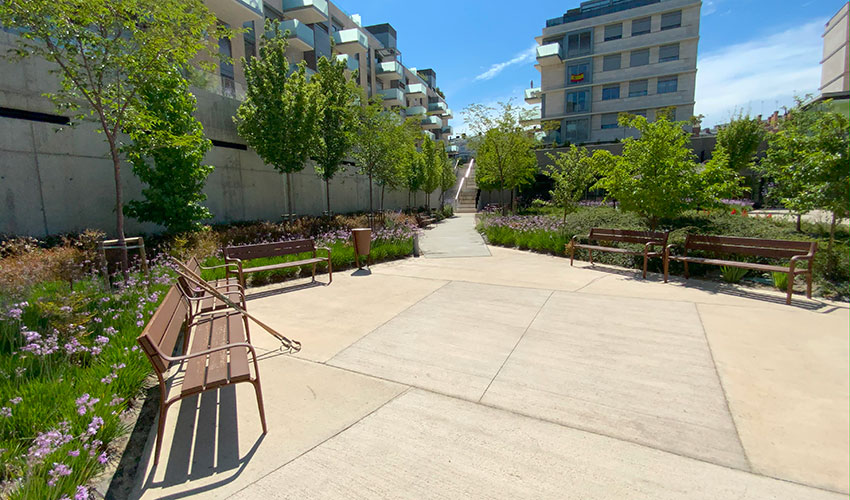 La vegetación, junto con los modelados del terreno y el diseño de los paseos, favorecen la creación zonas estanciales y de descanso, en donde se ubican bancos, algunos bajo la sombra de árboles. Gran parte de las circulaciones, resueltas en su mayor parte con diferentes acabados de hormigón, serpentean entre grandes masas de vegetación y colinas que ayudan a resolver los jardines sobre cubiertas, generando distintos ámbitos en un mismo espacio.