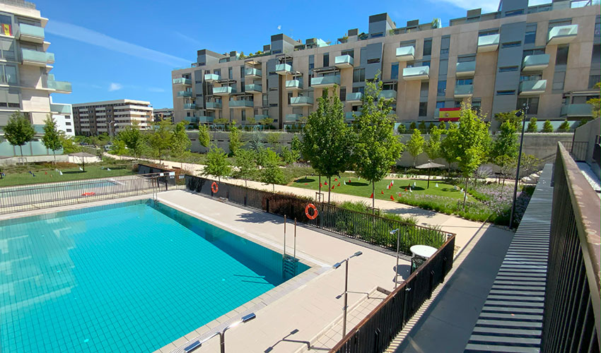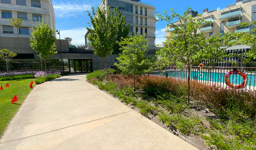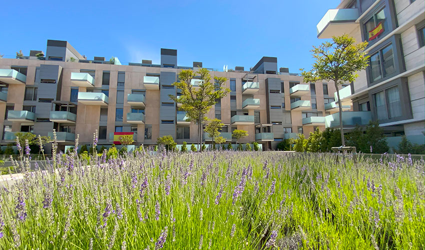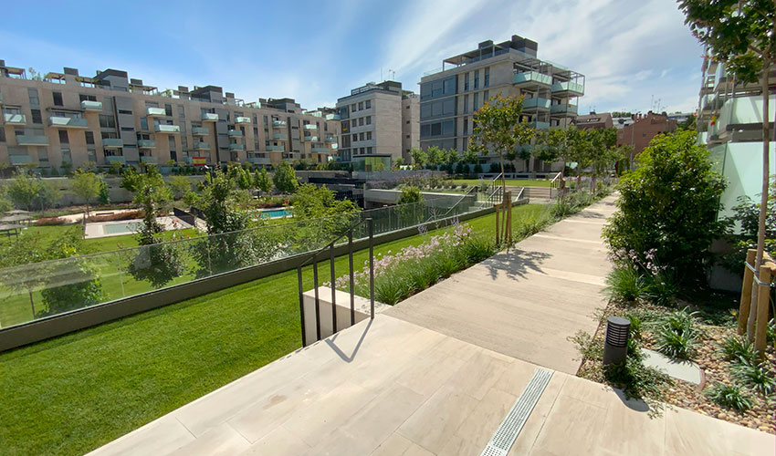 Las amplísimas zonas verdes de esta urbanización, el parque lineal, el campo de golf, el monte de El Pardo y la Sierra de Guadarrama perfilada en el horizonte confieren una singularidad a este proyecto que realza la estrecha relación de la naturaleza con las viviendas, presente desde los primeros bocetos en una búsqueda constante que se concreta en el aspecto fragmentado de las edificaciones que permite disfrutar de tan privilegiado enclave, para ello todas las viviendas disponen de un espacio exterior privado de transición como prolongación de la propia vivienda.