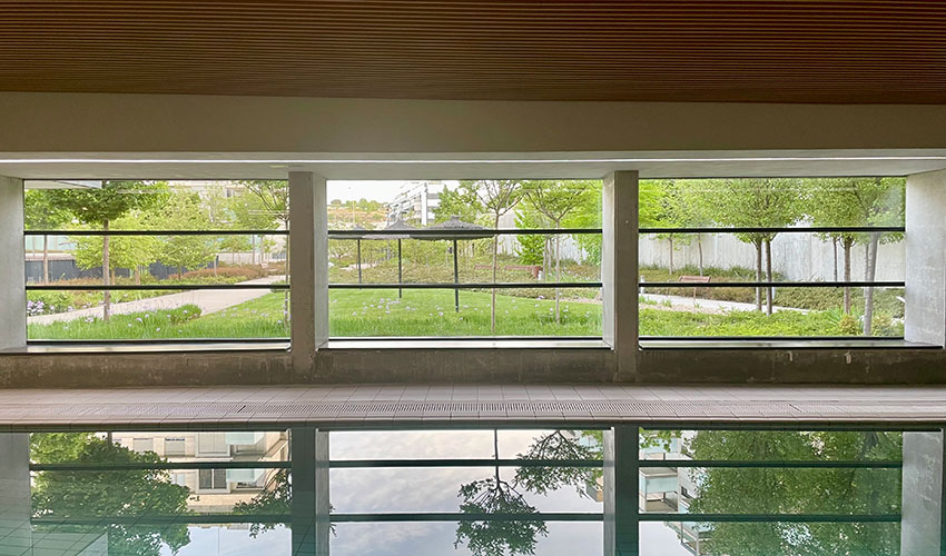 Las construcciones abrigan y protegen un interior reservado a escala del hombre, a la vez que lo ponen en relación con el parque lineal público, espacios que se modelan por la luz filtrada y tamizada a través de grandes aperturas, que los ponen en relación directa con la naturaleza.