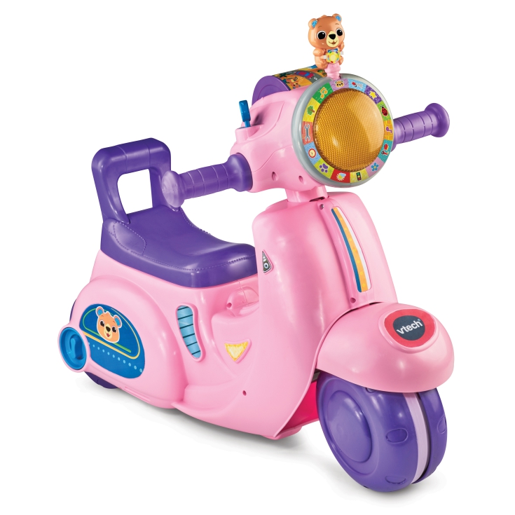 Este scooter se puede transformar en triciclo, ideal para el desarrollo motriz de los más pequeños. Cuenta con dos botones: uno para escuchar canciones y otro para aprender números y colores. Al desplazarse, el sensor de movimiento activa divertidas respuestas y reacciones, fomentando el juego activo.