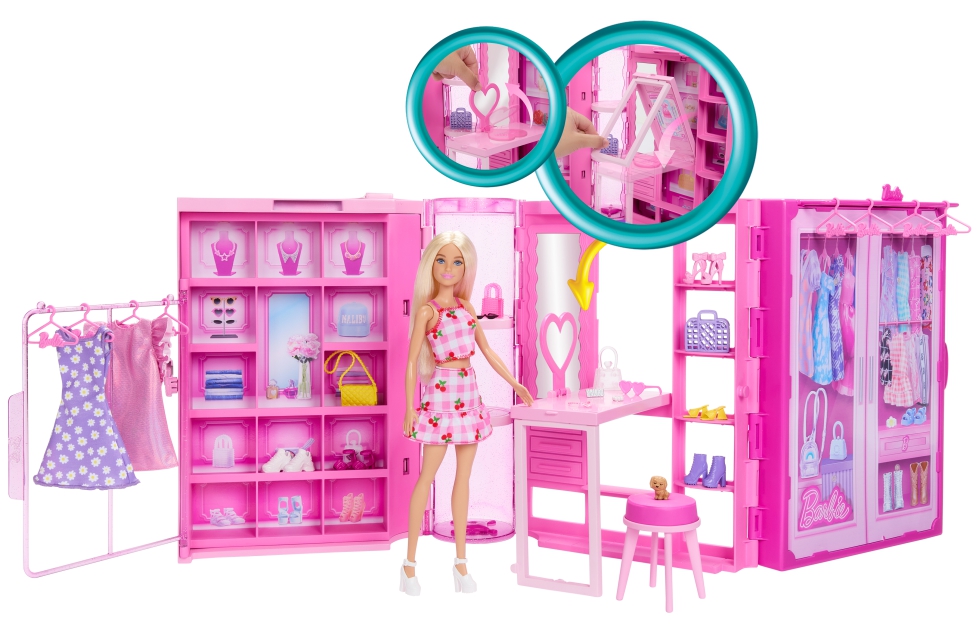 Este Armario de Ensueño de Barbie está repleto de estilos e historias infinitas que los niños pueden crear para Barbie. Abre el armario rosa con brillo para revelar un set de juego de casi un metro de ancho con 2 percheros, más de 20 compartimentos de almacenamiento, un tocador plegable con un espejo desplegable, un espejo de cuerpo entero y un estante para zapatos. A los niños les encantará vestir a Barbie con más de 25 prendas y accesorios como vestidos, zapatos, collares y un montón de bolsos.
