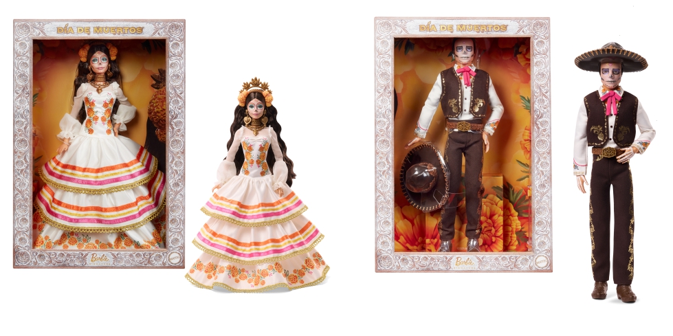 La colección Día de Muertos de Barbie regresa en 2025 con dos muñecos de edición especial que rinden homenaje a esta festividad tan especial a través de la simbólica flor de la caléndula (cempasúchil), emblema de la unión entre los vivos y los muertos. El regalo perfecto para cualquier coleccionista. La muñeca Barbie luce un vestido color crema con volantes, detalles dorados y lazos brillantes, adornado con flores que evocan los altares tradicionales. Su estilo se completa con una corona de caléndulas, pendientes largos, múltiples collares, mangas transparentes y un cuidado maquillaje de calavera. Ken, por su parte, viste un traje en tonos crema y negro, con ribetes metalizados y flores doradas que destacan en el chaleco, el pantalón y los puños de la camisa. El conjunto se realza con una corbata de lazo, sombrero y maquillaje de calavera, además de detalles esqueléticos en las manos.