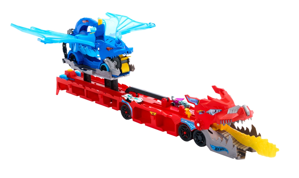Vive la aventura más épica con el Dragón Transportador con ataque doble definitivo de Hot Wheels. Este imponente set ofrece doble acción con dos fieros dragones: el más grande derriba coches con su “aliento de fuego” y puede transformarse en una pista de carreras de dos carriles, mientras que el dragón más pequeño bate las alas y se lanza sobre los vehículos para engullirlos en plena caza. El set incluye dos vehículos Hot Wheels metálicos a escala 1:64 y tiene capacidad para guardar más de 20 coches en su interior. Con funciones de lanzamiento, carreras y almacenamiento, este dragón convierte cada partida en una experiencia trepidante llena de diseño, detalle y creatividad.
