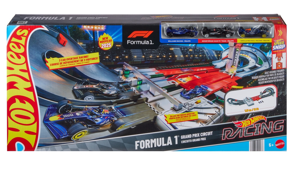 Vive la emoción de la Fórmula 1 con el Circuito del Grand Prix de Hot Wheels, un set que recrea toda la adrenalina de las carreras reales. El propulsor de tres carriles impulsa a los coches a toda velocidad a través de curvas dinámicas y cambios de elevación, mientras el contador de vueltas marca cada paso hacia la meta. El sistema de DRS interactivo permite adelantamientos estratégicos en plena curva, y el primero en cruzar la línea de meta será el campeón. El conjunto incluye tres coches metálicos de F1 Hot Wheels a escala 1:64 y ofrece dos modos de juego: carreras con vueltas contadas o modo infinito para competir sin parar. Gracias a los conectores Speed Snap, la pista puede ampliarse con otros sets de Hot Wheels (se venden por separado). Asimismo, ha sido ganador en los Premios Mejor Juguete 2025 en la categoría de ‘Mejor Vehículo, Radiocontrol y Pistas’.