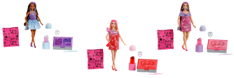 La nueva serie Barbie Party Unboxed Glam Party convierte el unboxing en una auténtica celebración. Cada set incluye 10 sorpresas ocultas en una pila de 4 regalos que esconden una muñeca, una mascota y accesorios de moda para prepararse para la fiesta. La diversión comienza con una muñeca Barbie con toalla de baño, turbante y mascarilla facial. Al retirarlos, se revela a Red Sparkle, una muñeca con una larga melena rubia ondulada. Las sorpresas continúan al abrir los distintos compartimentos: perfora cada sección con la brocha de maquillaje incluida para descubrir complementos, y destapa el tubo con forma de pintalabios para encontrar un slime de gelatina con un adorable gatito en su interior.