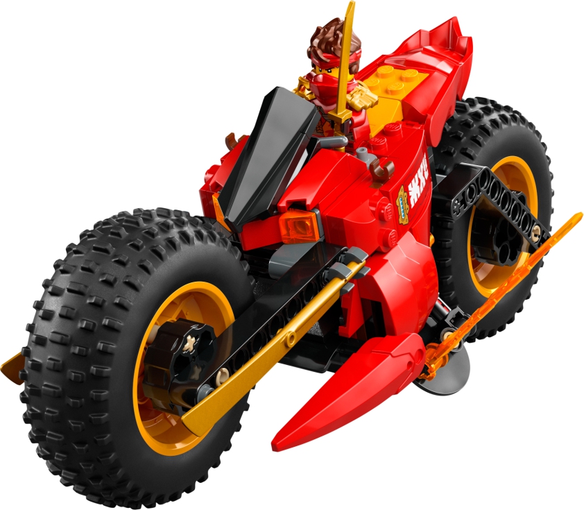Las aventuras del universo Lego Ninjago también se disfrutan sobre ruedas, como con este gran vehículo, convertible en otros 3 más pequeños: la moto ninja de Kai, la moto ninja de Wyldfyre y el reactor de Frak.