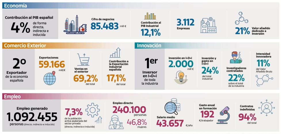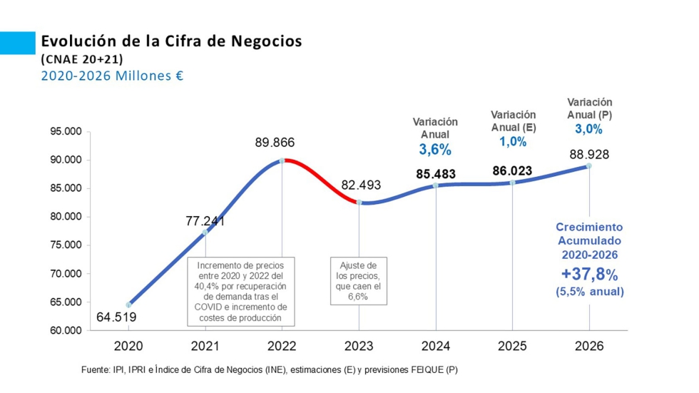 Con ello, la industria química española acumulará entre 2020 y 2026 un crecimiento de su cifra de negocios del 37,8%, lo que equivale a un ritmo medio anual del 5,5%, reforzando su papel como segundo mayor sector industrial del país.