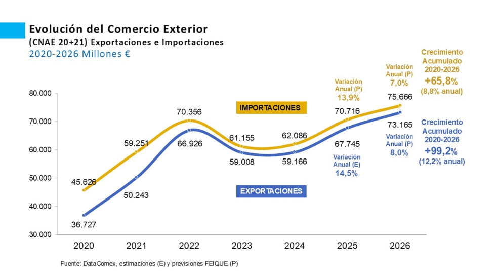 De cara a 2026, las previsiones apuntan a un nuevo incremento del 8% en exportaciones que permitirán consolidar un crecimiento acumulado del 99,2% en el comercio exterior del sector desde 2020, lo que supone un crecimiento medio del 12,2% anual en el periodo. En el caso de las importaciones, se espera que crezcan un 7%.