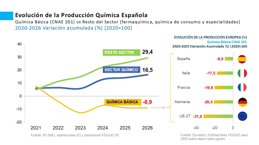A pesar del descenso experimentado por la Química Básica española, éste ha sido mucho menor que la media de la UE, donde la producción ha caído un 31,9% desde 2020. En países como Alemania (-20,4%), Francia (-19,9%) o Italia (-17,5%), el deterioro ha sido aún más pronunciado, lo que sitúa a España como el país europeo con mejor comportamiento pese a las dificultades estructurales que enfrenta este subsector.