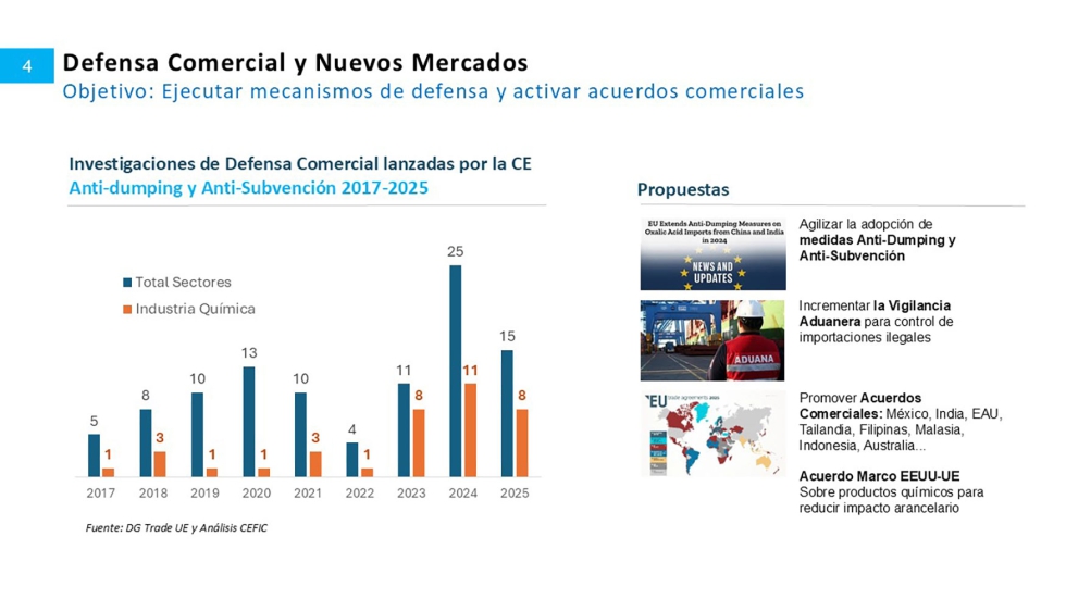 En los últimos dos años, la Comisión Europea ha intensificado sus actuaciones antidumping y antisubvención: de apenas diez procedimientos entre 2017 y 2022 a 27 en solo treinta meses. En el caso de los productos químicos, se encuentran en vigor 46 medidas de protección. El sector reclama que la Comisión agilice al máximo los procedimientos de investigación, que actualmente se extienden de 12 a 18 meses, para evitar que los efectos del dumping sean irreversibles.