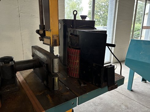 | Detalles | Technical characteristics Cast-iron frameSolid flywheel diameter 930 mmMax. cutting height : 550 mmMax. cutting width : 910 mmBlade dimensions : 6580 to 6670 x 90 x 0.9 mmBlade guideCast-iron table dimensions : 860 x 1100 mmTable inclination : 0 to 20 degrees11 kW (15 hp) motorRobust, enclosed machine2 suction nozzles diameter : 140 mmSteel toothed feeder Power and Motors Voltage: 400 VPluging: Three-phasedPower: 12 KwMotor: 15 CV Overall dimensions Lenght: 1880 mmHeight: 2860 mmWeight: 990 Kg |