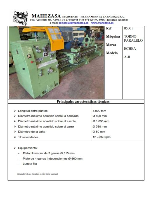 | Detalles | Longitud entre puntos 4.000 mm equipado con plato universal de 3 garras diámetro 315 mm, plato de 4 garra independientes de 600 mm y luneta fija |