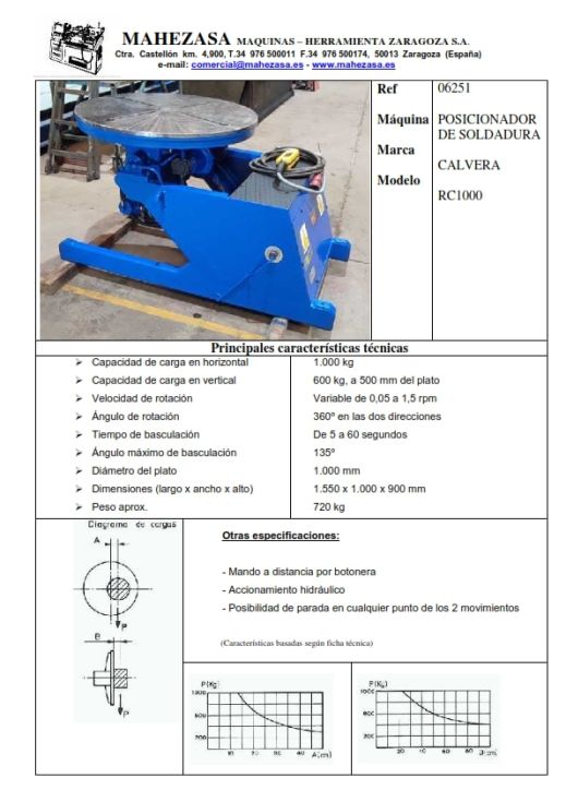 | Detalles | Capacidad de carga: en horizontal 1.000 kg en vertical 600 kg a 500 mm del plato, mando a distancia por botonera |