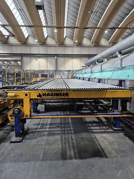 | Detalles | CHARACTERISTICS HEAT TREATMENT EQUIPMENT temperature max.: 950 °C Clear width 2,200 mm Usable width 2,070 mm Usable height 400 mm Working height 1,300 mm Inlet roller conveyor 14,700 mm Inlet box 2,500 mm Annealing furnace 29,169 mm (Annealing furnace clear length) approx. 26,769 mm Cooling section (HT and NT) 51,000 mm Outlet box 2,500 mm Outfeed roller conveyor 14,660 mm Total length 114,530 mm (annealing furnace and cooling section) N2 purge gas volume 420 m3 Furnace design: Roller hearth continuous furnace Material: Tubes Outer diameter: 14 - 180 mm Wall thickness: 0.8 – 8.0 mm Length: 4.0 – 13.0 m Surface before annealing: - - Throughput at 920 °C annealing material temperature Throughput at 700 °C annealing material temperature Reference pipes: 25 x 2.5 x 8000 mm 33 x 3.5 x 8000 mm 40 x 3.5 x 8000 mm 55 x 2.8 x 8000 mm 63 x 4 x 8000 mm 75 x 6 x 8000 mm 110 x 8 x 8000 mm Tube outlet temp., depending on tube surface: 125 - 150 °C Roller pitch inlet roller conveyor: 620 mm Roller pitch inlet box: 620 mm Roller pitch annealing furnace: approx. 430 mm Roller pitch cooling section: 500 mm Roller pitch outlet box: 620 mm Roller pitch outlet roller conveyor: 620 mm Roller dimensions: Annealing furnace: 155.4 x 14 mm 1.4848/1.4832 Front section HD cooling section: 157.0 x 10 mm 1.4826 (7 pieces) Remaining cooling section: 133.0 x 4 mm St 37 Max. permissible roll hearth load at a working temperature of 920 °C and even distribution of the hearth: 350 kg/m Furnace floor: Refractory lightweight brick: 130 mm Insulating bricks: 130 mm Mineral fibre board: 50 mm Side: Refractory lightweight bricks: 230 mm Mineral fibre board: 100 mm Ceiling: Suspended ceiling bricks and wool insulation 330 mm Ceiling thickness Ring bricks for roller passages made of fibre material Number of control zones: 6 (gas-heated) Operation of control zones: - (gas-heated) ON/OFF, with round-the-clock control - (electrically heated) ON/OFF, with thyristor control Thermocouples: NiCr-Ni Temperature recording range: 0 - 1,000 °C Temperature control measuring range: 0 - 999 °C Working temperature range: 450 - 950 °C Max. working temperature: 950 °C Throughput speed: 7.5 - 150 m/h Endogas consumption 84 litres per hour Automatic loading |