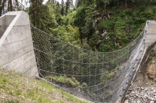 Estabilización de las márgenes: Debido a la alta energía de descarga en torrentes se puede producir la erosión de las paredes del canal. Consistente en una malla romboidal de alambre de acero de alto límite elástico >1770MPa, adosada a la superficie y sujetos mediante anclajes de diversos tipos en función de las características del terreno. Esta solución en general es complementaria a las barreras flexibles de redes de anillos de acero, aunque en casos excepcionales se emplean solas en las márgenes para controlar la erosión (fig. 5).