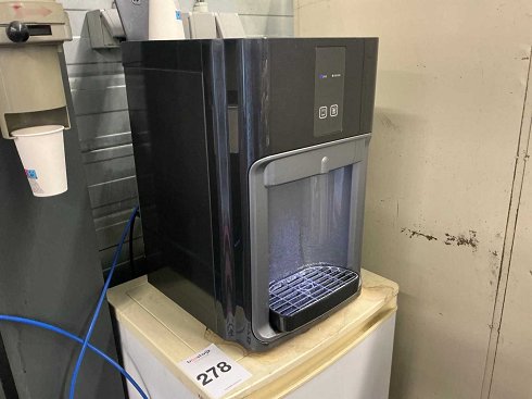 Dispensador de agua con conexión fija al suministro de agua, iluminación LED, tamaño aprox. 32 x 40 x 50 cm, equipado con portavasos en la máquina y portavasos externo, así como un modelo de mesa Exquisit frigorífico, tamaño aprox. 47 x 44 x 83 cm, |