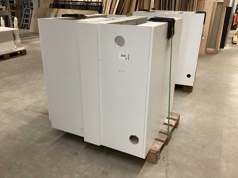 Aparador, compuesto por cuatro cuerpos con orificios de conexión, dos puertas cada una cerrable, material recubierto de plástico blanco, bordes de ABS de 2 mm Palets a cambio |