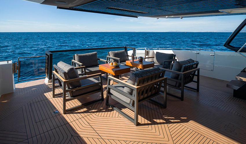 La bañera de popa de generosas dimensiones alberga en su interior comedor y zona chillout, con vistas al beach club mediante un panel protector acristalado que unifica toda la zona.