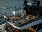La bañera de popa de generosas dimensiones alberga en su interior comedor y zona chillout, con vistas al beach club mediante un panel protector acristalado que unifica toda la zona.