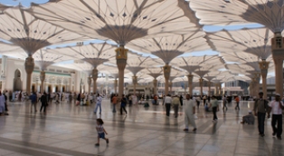 Liebherr firmó en el mes de diciembre de 2012 un contrato para la construcción de una gran sombrilla plegable para la Gran Mezquita en Meca con una de las grandes empresas de construcción en Arabia Saudí.La sombrilla encargada abierta dará sombra a una superficie de aproximadamente 2400 m². La membrana de la sombrilla en una altura de 30 m tiene una envergadura de 53 m. Se tensa mediante ocho brazos telescópicos de los que cada uno se compone de una articulación y dos piezas telescópicas hidráulicamente extensibles. En una mezcla de tecnologías probadas y soluciones nuevas a desarrollar, la sombrilla es tanto una obra de construcción como un sistema tecnológicamente exigente con un control complejo desarrollado específicamente por Liebherr. Grandes desafíos resultan, por una parte, del desarrollo de los componentes y el mecanismo de plegado y, por otra, del volumen de los pesos a mover, la fabricación de las grandes piezas y del montaje de la membrana. La sombrilla con un peso total de 600 t se montará en los próximos dos años en la fábrica de Liebherr en Ehingen, se comprobará y se suministrará a la Gran Mezquita a Meca.