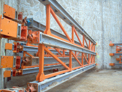 Al principio era necesario reforzar los puntales Megashor para evitar cualquier arqueo o curvatura de las mismas a tanta distancia. En obras anteriores utilizaron vigas Superslim para esta finalidad pero había que mejorar este sistema, por lo que aquí diseñaron y fabricaron una serie de bastidores triangulares de acero que se podían enganchar directamente a la viga Megashor y recorrer la longitud de cada puntal. Elegieron el triángulo por ser la forma geométrica más indeformable, pero éste también simplificó el diseño, la fabricación y la aplicación final de los bastidores triangulares, así como aumentar la capacidad de las cargas de los pórticos Megashor gracias a las uniones más rígidas entre las vigas Megashor y los bastidores.