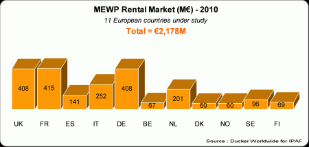 Según el informe de IPAF de 2011 sobre el alquiler de plataformas aéreas en Europa (IPAF European Powered Access Rental Report 2011), los ingresos del alquiler de PEMPs en los 11 países europeos objeto de estudio se mantuvieron estables y se calcula que ascendieron a 2 200 millones de euros en 2010. Esta cifra representa alrededor del 85% del mercado total europeo (conformado por los 27 países más Noruega), que habría alcanzado un valor de aprox. 2 600 millones de euros, gracias al mercado de alquiler de PEMPs.