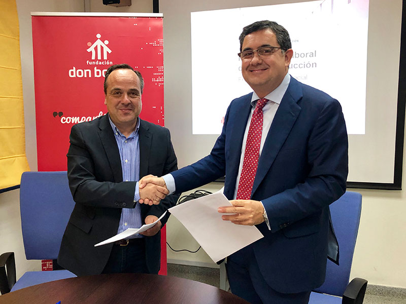 El director general de la Fundación Laboral de la Construcción, Enrique Corral Álvarez, y el director general de la Fundación Don Bosco, Ignacio Vázquez de la Torre Prieto, han firmado en Córdoba -donde la Fundación Don Bosco tiene su sede- un acuerdo de colaboración de ámbito estatal, por el que ambas entidades aunarán esfuerzos para realizar acciones que faciliten la inclusión y la mejora de la empleabilidad de las personas que tienen menos oportunidades de acceso al empleo.