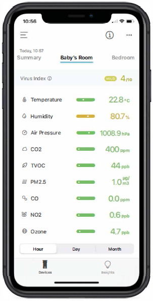 El índice de uHoo muestra hasta 10 categorías, dentro de 4 niveles: bueno, medio, malo y grave. Cada uno se determina en base al análisis científico de cinco factores de calidad del aire que incluyen temperatura, humedad relativa, PM2.5, dióxido de carbono y dióxido de nitrógeno.