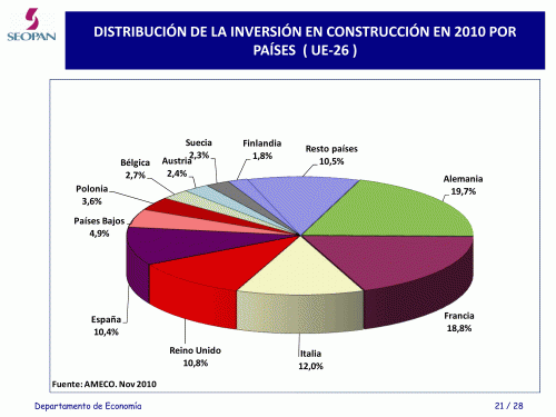 En 2010 España bajó desde el cuarto hasta el quinto puesto en el ránking de países de la UE con mayor inversión en construcción, en favor de Reino Unido, que se coló así entre los cuatro primeros, un grupo que completan Alemania, Francia e Italia. No obstante, pese a las caídas y los ajustes en la inversión pública, España cierra el ejercicio 2010 como tercer país de la UE que más invierte en construcción en comparación a su PIB. En concreto, la inversión en esta actividad supuso el 12,7% del PIB; frente a las tasas del 13,1% y el 13%, respectivamente, de Finlandia y Polonia. Se trata además de un porcentaje que supera en más de dos puntos porcentuales a la tasa media de la UE (10,4%).