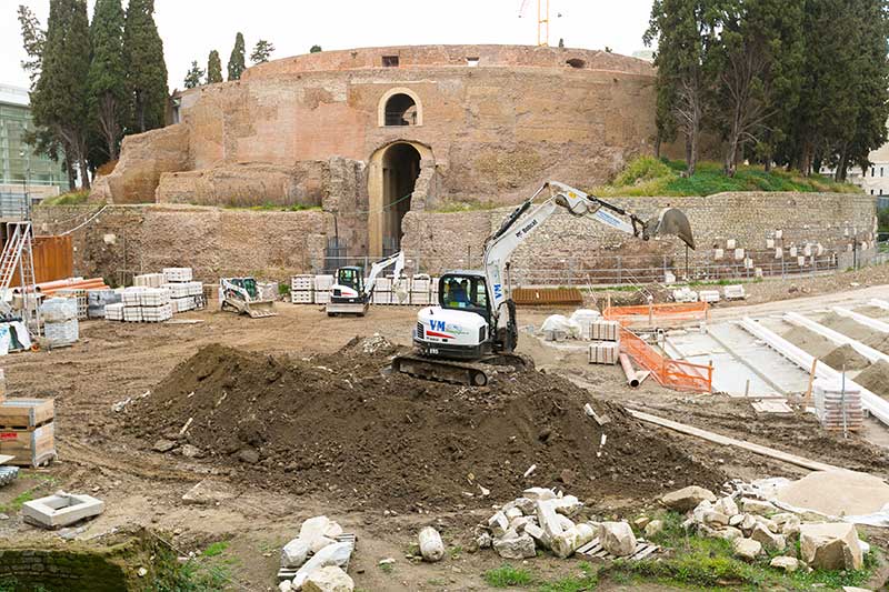 Además de la excavación arqueológica, las cinco máquinas Bobcat también están trabajando en la transformación de la plaza Augusto Imperatore, frente al Mausoleo, en un espacio público, que albergará la taquilla del Mausoleo y una cafetería. La plaza estará conectada al nivel de la calle por dos impresionantes escaleras, una en el lado del museo Ara Pacis y la otra hacia la iglesia de San Carlo al Corso, recreando de hecho un anfiteatro, que en el futuro albergará espectáculos al aire libre.