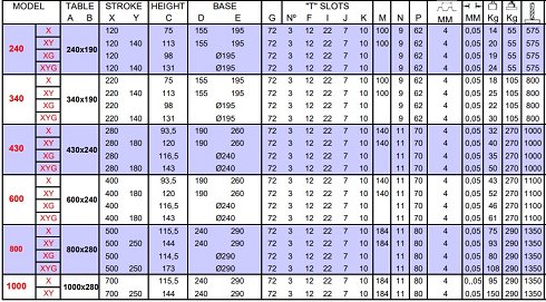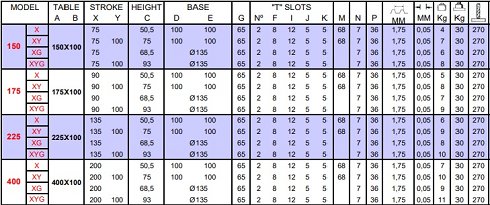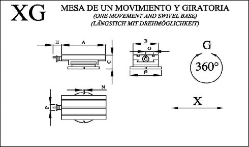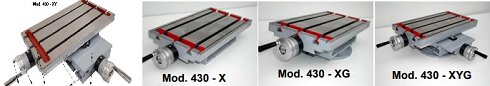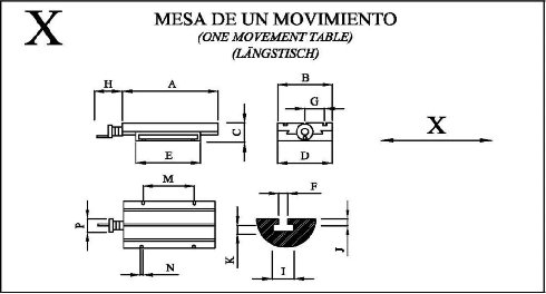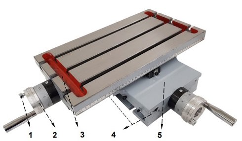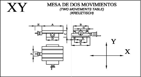Mesa de coordenadas manual con diferentes posibilidades y tamaños para adaptarse a cualquier tipo de máquina: taladros, fresadoras, etc. La características común de todas las mesas es un diseño ergonómico, con protección y engrasadores exteriores para husillos, tuercas y guías. Las tuercas son autoajustables y se fabrican en varias medidas, para adaptarse lo mejor posible a la máquina que complementa. En el siguiente detalle se identifican las partes principales de las mesas de coordenadas manuales: